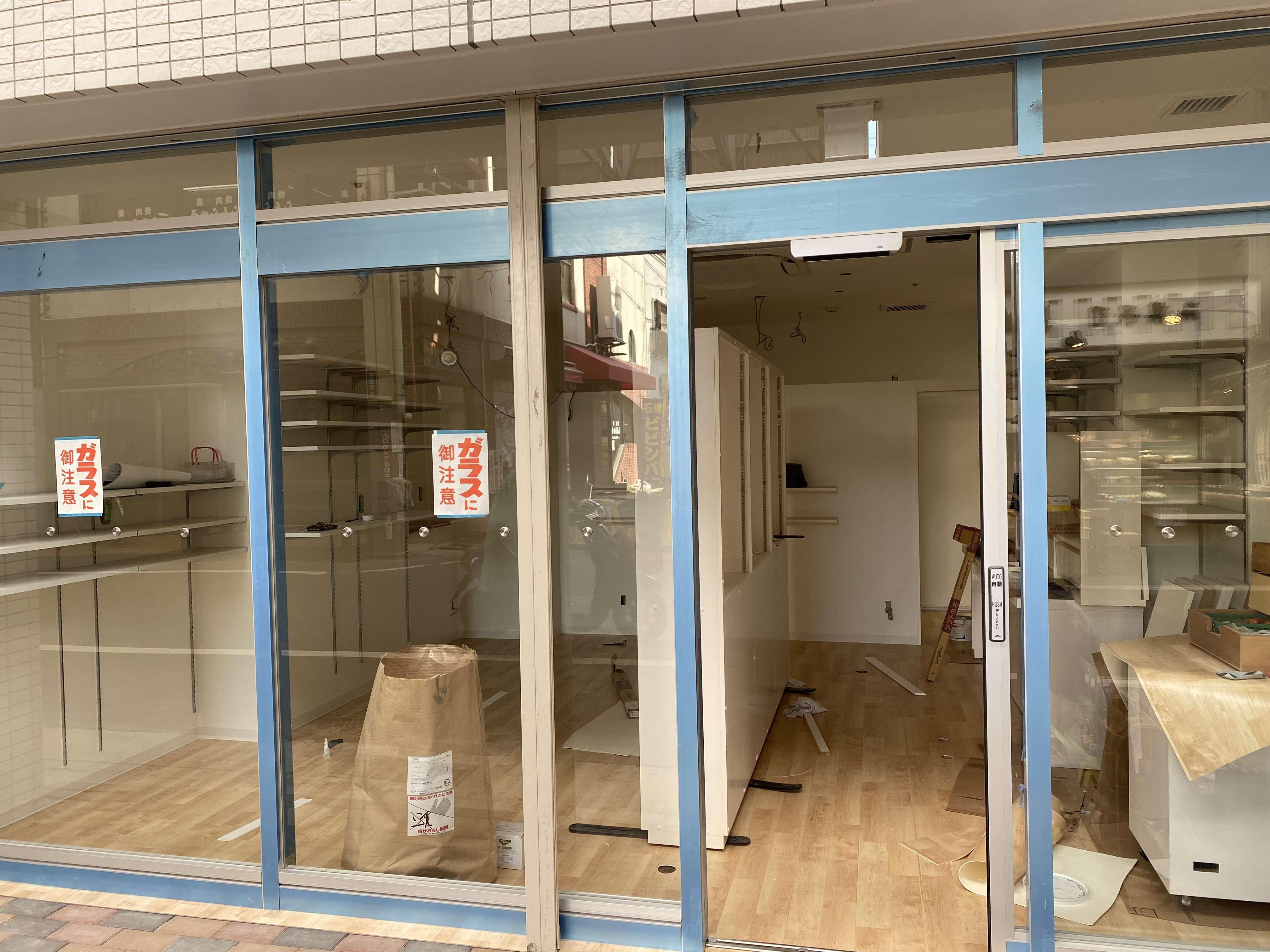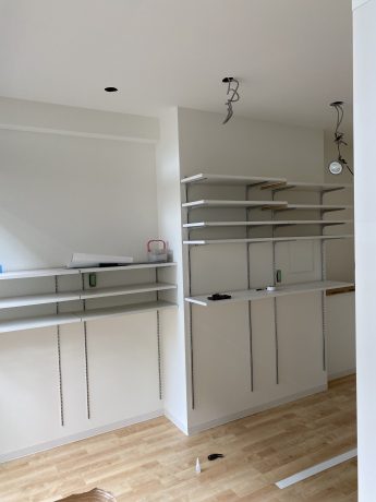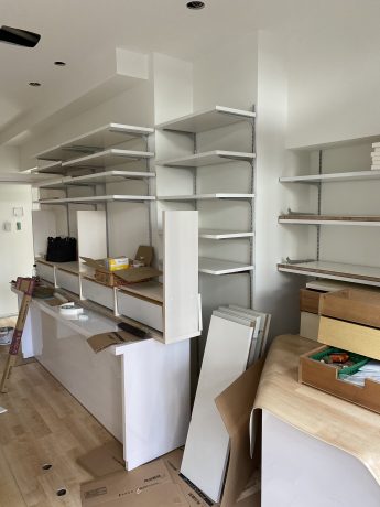 商品の陳列棚が完成しつつあります☆クロスや床も貼られてお店らしくなってきました♪