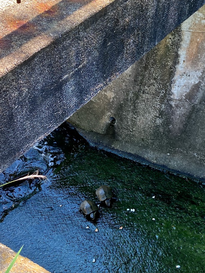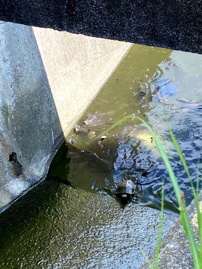 亀が餌を食べる前に鯉に食べられてしまうので娘も亀さん早くーーー!!と叫びながら餌あげてます。