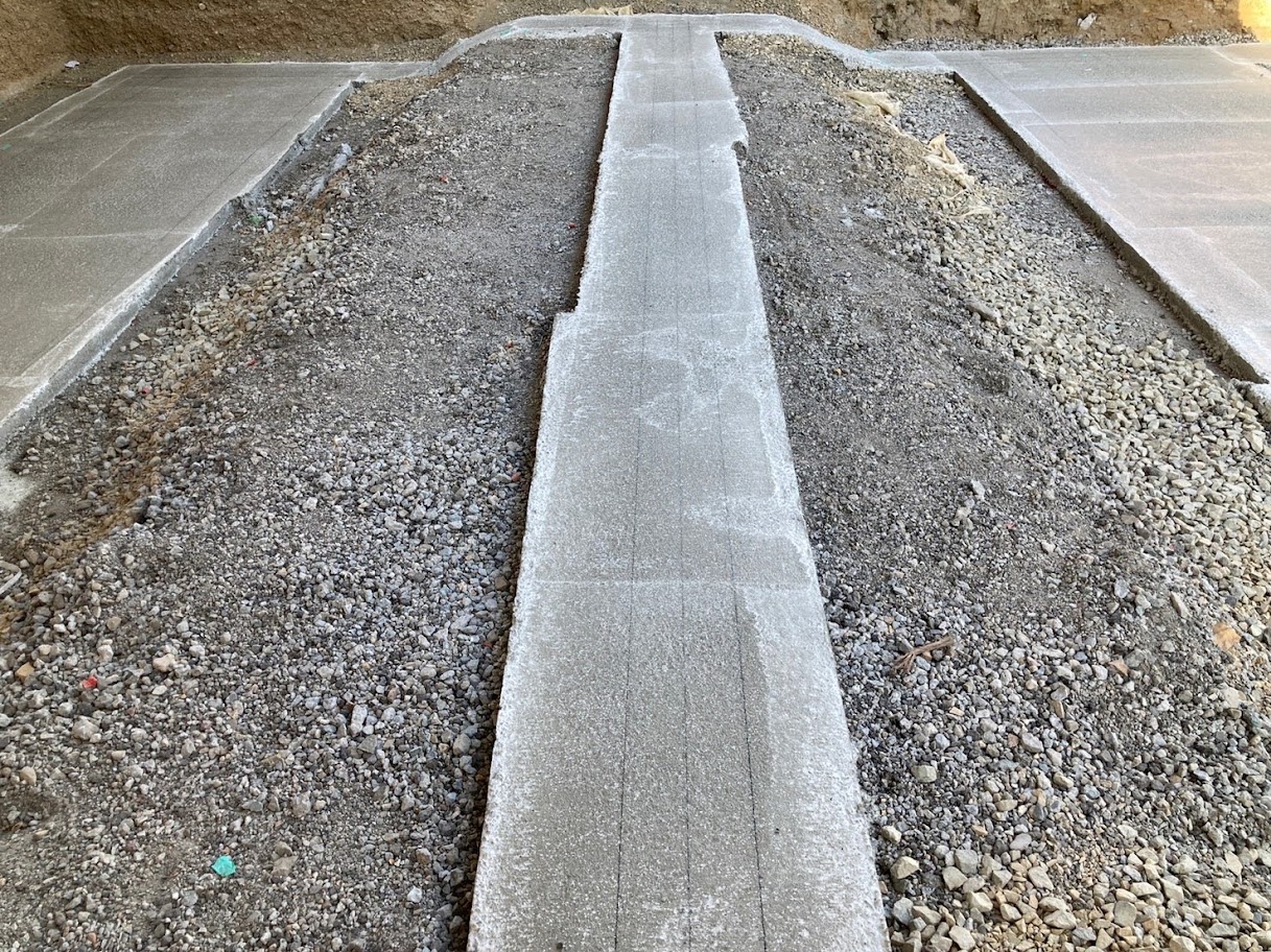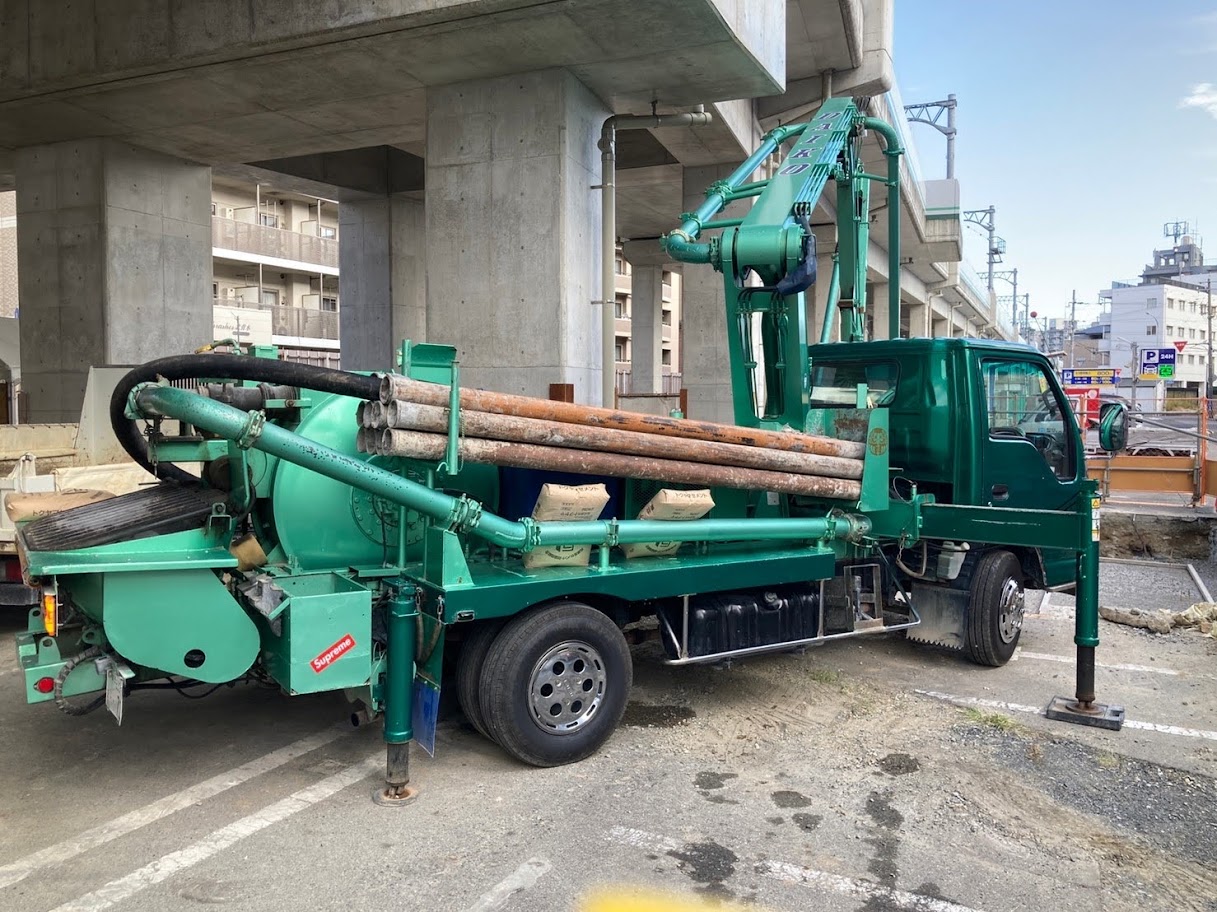 びよょーーーーんと伸びている長いホースからコンクリートが流れ出てきます