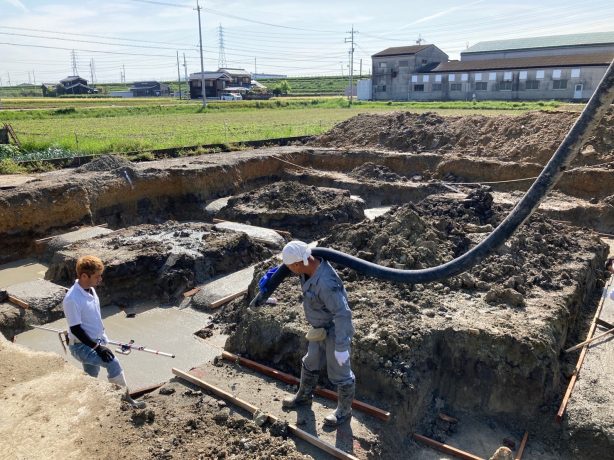 安定した基礎を作るために掘削した箇所を締固め、コンクリートを流し込み