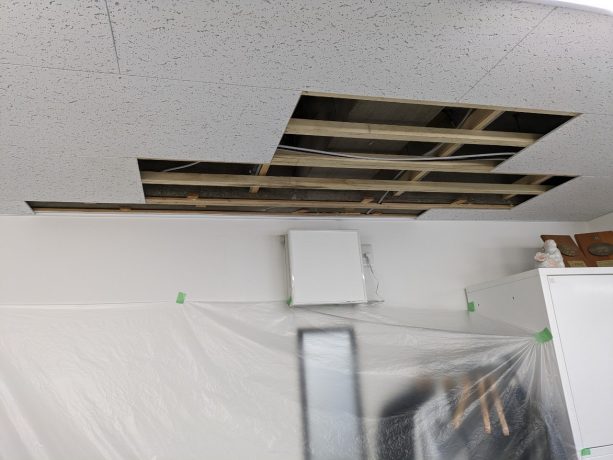 他の部分を汚したり、気づ付けないようしっかりと養生し、天井を剝がします。